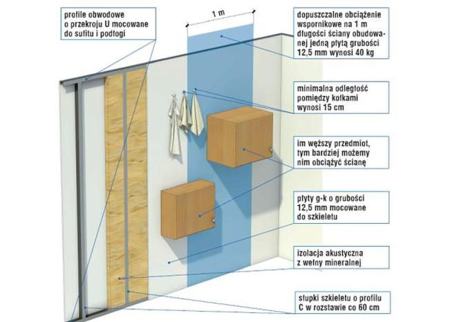 Je lepší zavěsit předměty na sádrokartonové stěny pomocí speciálních kotev ukotvených v materiálu nebo ze zadní části desky. Potom můžeme dělicí stěnu naložit více, ale ne více než 35 kg na jeden hmoždinka, přičemž si uvědomíme, že těžiště zavěšeného prvku by nemělo být dále než 20 cm od zdi. Použitím více hmoždinek, tlustší desky (18 mm) nebo dvou nebo dokonce tří vrstev desky lze zatížení trochu zvýšit. Rozšíření sloupků kostry neovlivňuje sílu samotné desky.