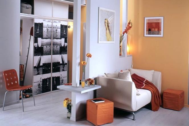 Zde je nabídka pro ty, kteří mají rádi silné barvy, výrazné kombinace a otevřený prostor. Vybrání v hale bylo částečně uzavřeno posuvnými dveřmi z HDF. Jsou zakončeny hliníkovými profily a namontovány na vedení. Desky dostaly poněkud avantgardní charakter zakrytím zepředu zvětšenými tisky černobílých fotografií.
